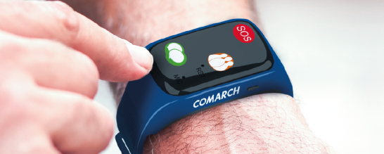 Chiamata rapida con numeri di telefono preferiti, monitoraggio della frequenza cardiacageolocalizzazione di chi indossa Comarch Wristband: per vivere sicuri e seguiti da un caregiver digitale sempre a portata di mano.